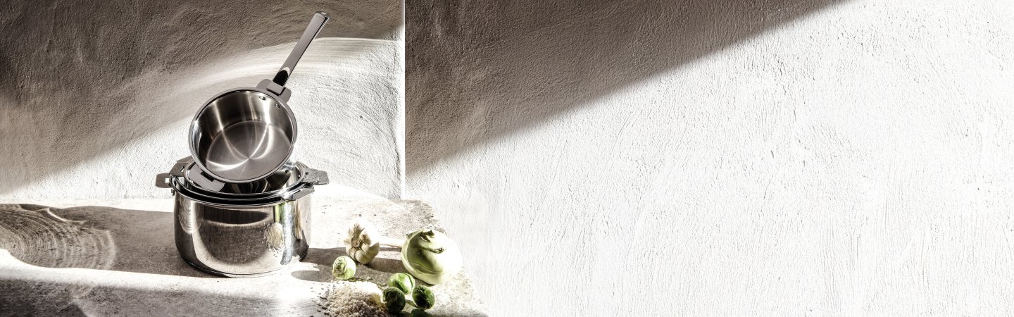 Une collection d’ustensiles de cuisson inox aux lignes pures et à la finition brossée.