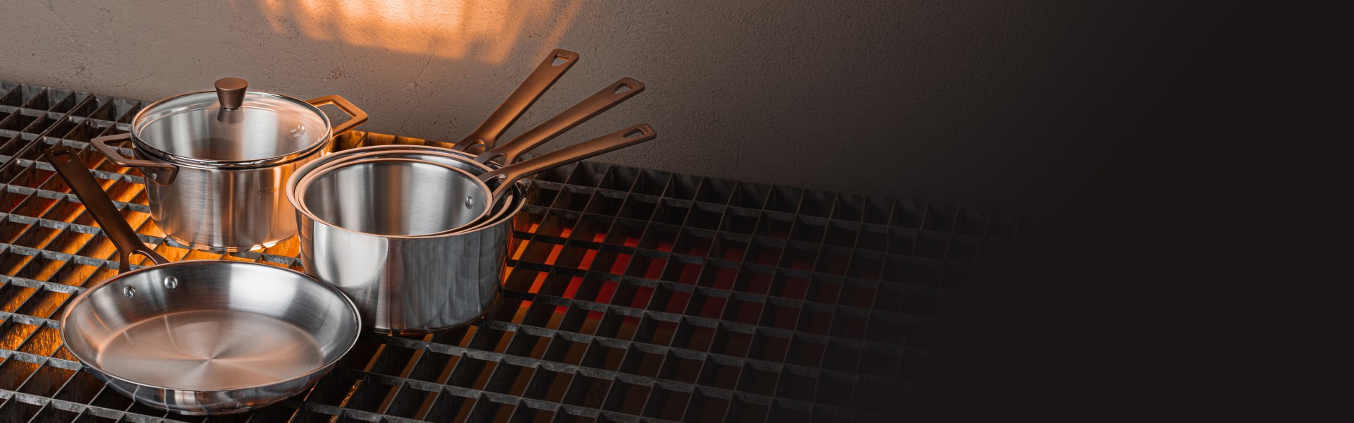 Une collection d’ustensiles de cuisson inox aux lignes pures et à la finition brossée.