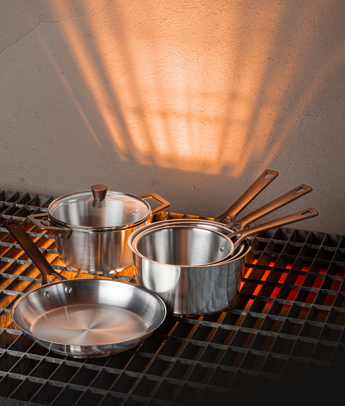 Une collection d’ustensiles de cuisson inox aux lignes pures et à la finition brossée.