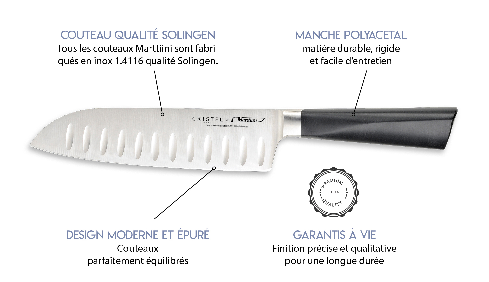 Utilisé aussi bien par les professionnels que par les particuliers, le couteau Japonais multifonction Santoku vous offrira une grande polyvalence de découpe. Hâcher de la viande, émincer des légumes ou découper du poisson ne seront que bonheur et facilité avec le couteau Santoku de CRISTEL par Marttiini. Lame : 18 cm | | |  | | Paiement sécurisé | | Transactions 100% sécurisées | |  | Garantie à vie contre tous vices de fabrication | | Contre tous les défauts de fabrication | |  | | Points de vente | | Trouvez le point de vente le plus proche de chez vous | | Me désabonner