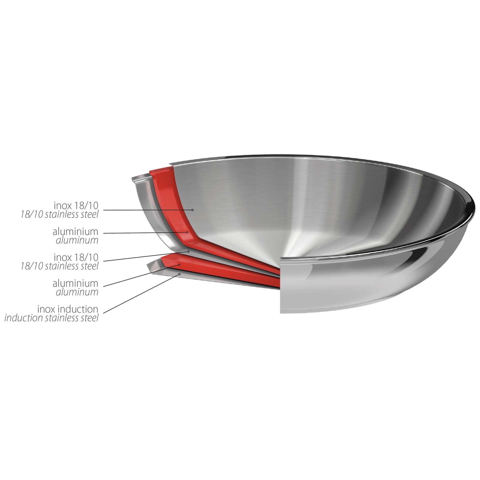 Pfanne aus hochglanzpoliertem Edelstahl in Multiply-Technologie aus 3-Schicht-Material Edelstahl / Aluminium / Edelstahl an den Seiten und 5 Schichten Edelstahl/ Aluminium / Edelstahl / Aluminium / induktionsgeeigneter Edelstahl am Boden. Pfanne mit Antihaftbeschichtung Exceliss+. Die drei übereinander liegenden Schichten an den Seiten der Pfannen aus der Reihe Casteline sorgen für eine gleichmäßige Wärmeverteilung im gesamten Pfannenkörper vom Boden bis zum Rand und nicht nur über den Thermodiffusionsboden.