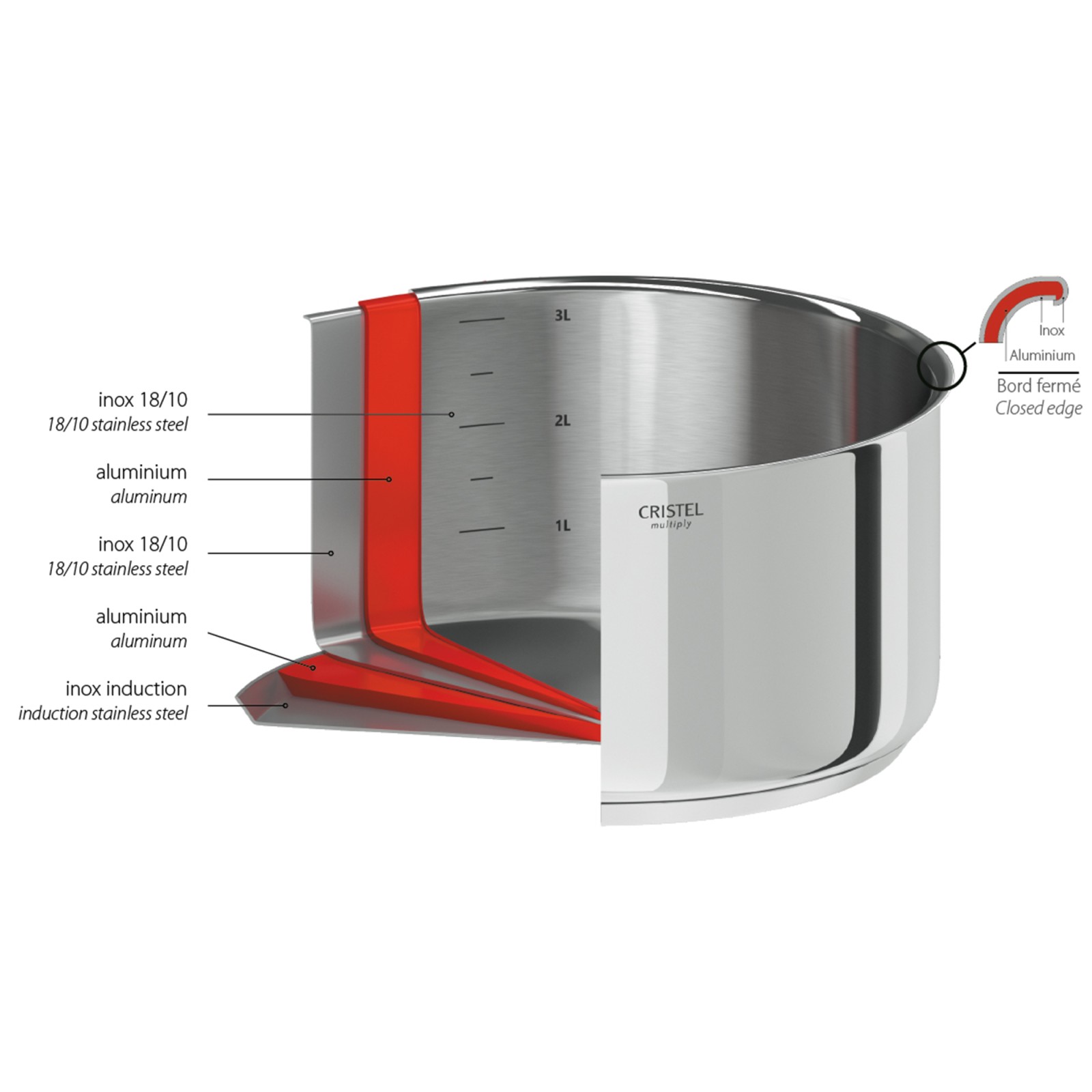 Die drei übereinander liegenden Schichten an den Seiten der Pfannen aus der Reihe Casteline sorgen für eine gleichmäßige Wärmeverteilung im gesamten Pfannenkörper vom Boden bis zum Rand und nicht nur über den Thermodiffusionsboden.