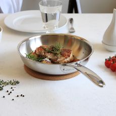 Der Stielgriff aus nicht wärmeleitendem massivem Edelstahl, der durch Edelstahlnieten perfekt mit dem Körper der Kasserolle verbunden ist, wird auf einem Glaskeramikkochfeld nicht heiß.