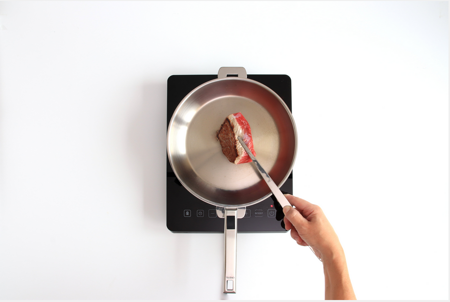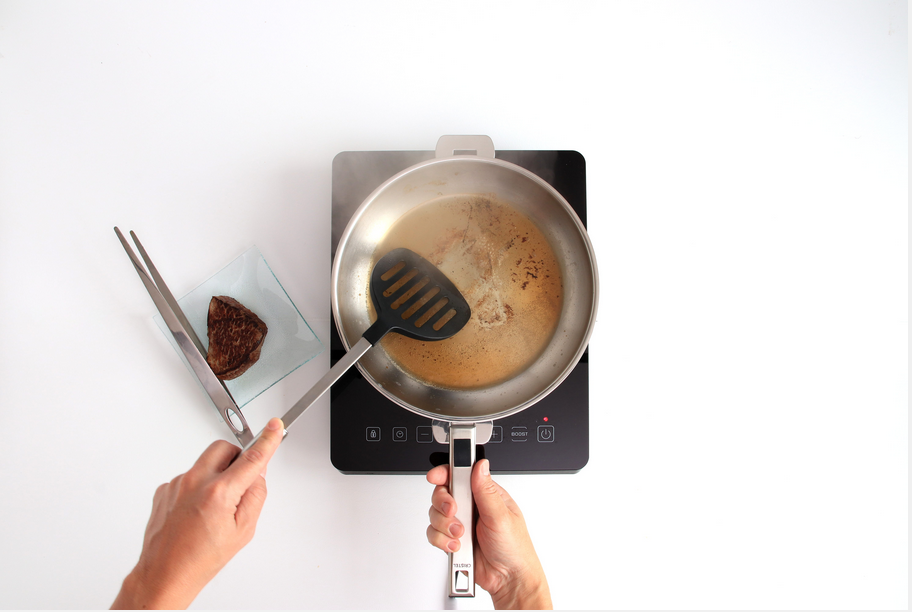 Das erste wichtige Regel ist, dass die Pfanne richtig heiß sein muss, bevor etwas hineingelegt wird. Wir empfehlen, sie zwei Minuten lang bei 2/3 der höchsten Leistungsstufe Ihrer Herdplatte heiß werden zu lassen, bevor Sie das Fleisch hineinlegen. Das richtige Aufheizen der Pfanne ist der Schlüssel für den Erfolg beim Kochen mit Edelstahl. Ganz allgemein gilt: je kürzer das Fleisch in der Pfanne ist, umso zarter wird es sein.
