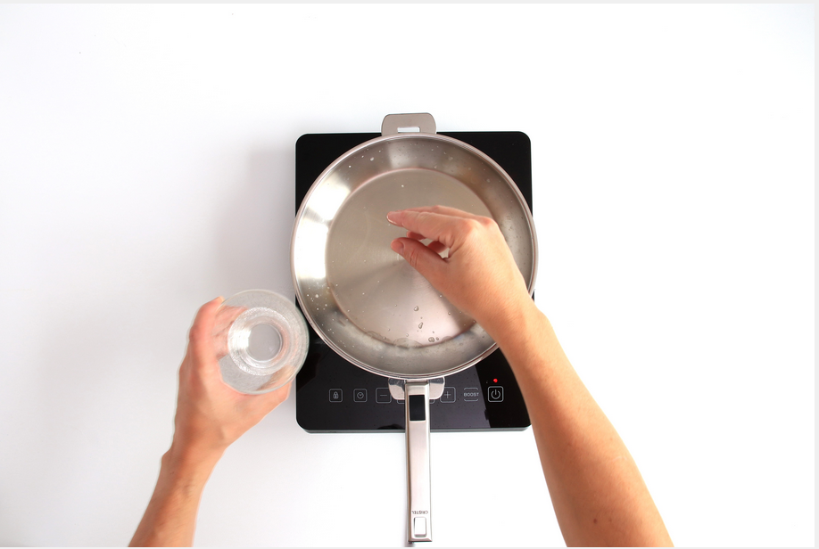 Wenn ein Steak oder ein Rinderfilet in eine kalte Pfanne gelegt wird, tritt der Fleischsaft beim Heißwerden der Pfanne nach und nach aus, das Fleisch gart also im heißen Dampf des Fleischsafts, statt angebraten zu werden. Die Zeiten für das Vorheizen können bei Pfannen, die für Gas-, Elektro- oder Induktionsherd geeignet sind, je nach Herd verschieden sein. Aber keine Angst! Es gibt einen einfachen Test, der Ihnen zeigt, wann der ideale Zeitpunkt gekommen ist, um das Fleisch in die Pfanne zu legen (siehe Schritt 2).