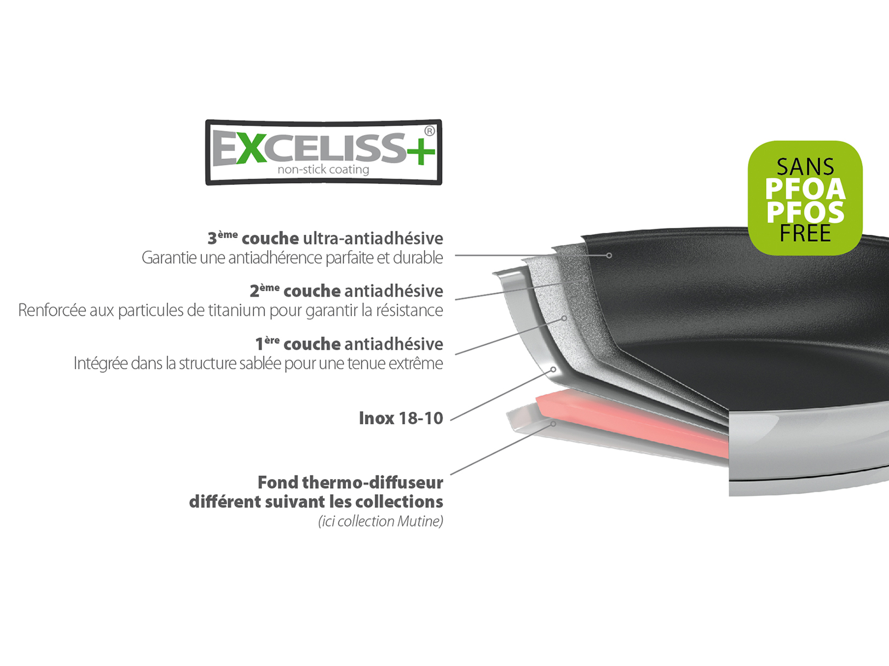 Unsere CRISTEL-Produkte mit der Antihaftbeschichtung Exceliss+ aus französischer Fertigung wurden mit einer 3-fachen Antihaftschicht konzipiert, um beste Ergebnisse zu garantieren. Die beiden untersten Schichten wurden für eine deutlich bessere Abrasionsfestigkeit vor allem mit Titanpartikeln verstärkt. Die abschließende Schicht hat nur ihre Antihaft-Aufgaben zu erfüllen.