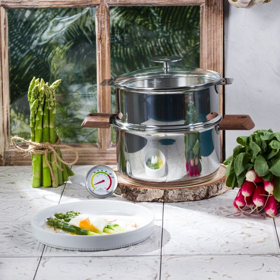 Das Garen mit einem Dampfkocher bewahrt und respektiert die Qualität Ihrer Lebensmittel. Beim schonenden Garen wird der Kontakt der Lebensmittel mit Wasser verhindert und sie behalten alle ihre Eigenschaften, ohne dass während des Garens Fett hinzugefügt werden muss. Für eine gesunde Zubereitung sollten Sie daher langsames Garen oder Dampfgaren bevorzugen.