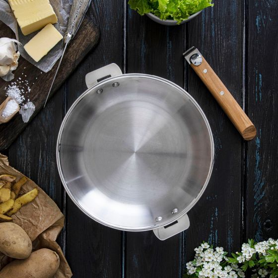 You would like to buy a stainless steel pan, but you are not really sure about which one to pick? In this guide you will find several selection criteria that should help you find the stainless steel pan that best suits your needs. But before we delve into the meat of the issue, you should first understand why you should choose a stainless steel model rather than a cast iron, aluminum or Teflon one. In short, stainless steel is a durable material, which means that your kitchen utensils will last a very long time. But wait, there is more: stainless steel is healthier. Stainless steel is both sanitary – as it contains no particles that are harmful to food – and extremely durable. As a matter of fact, stainless steel is the material of choice for surgical tools. CRISTEL products are 97% recycled and 100% recyclable. They are also composed of 18% chrome and 10% nickel. Want to know how to choose your stainless steel pan? Discover our comprehensive buyer's guide.