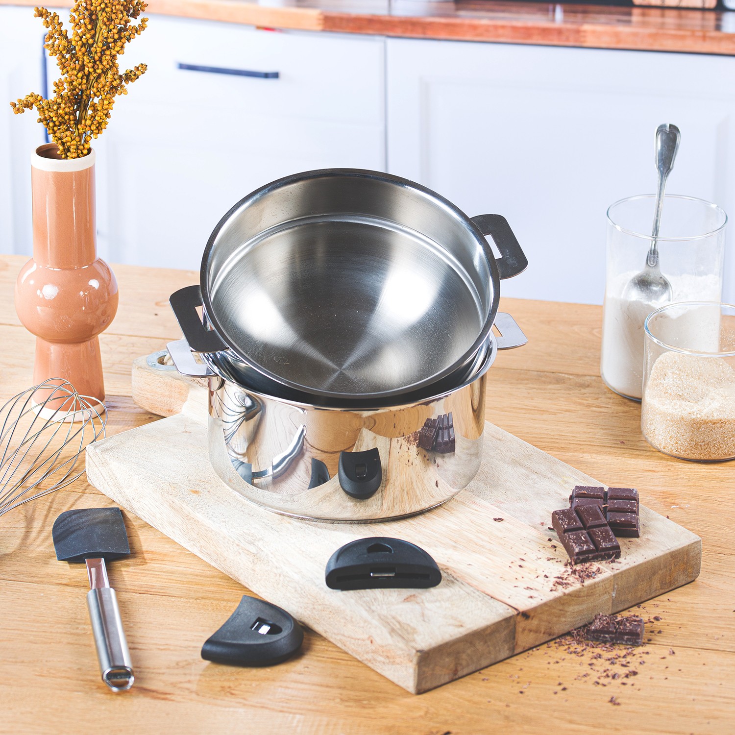 Polished stainless bain-marie inserts from the Removable Mutine collection are compatible with CRISTEL saucepans of the same diameter and remain totally stable.