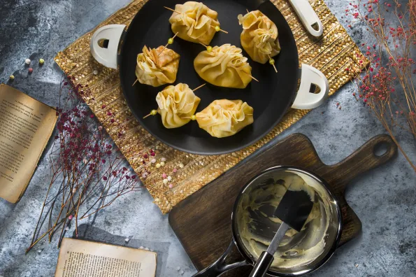 9 Spoon out some Diplomat cream into the middle of the crepe and close the dumpling with a toothpick.