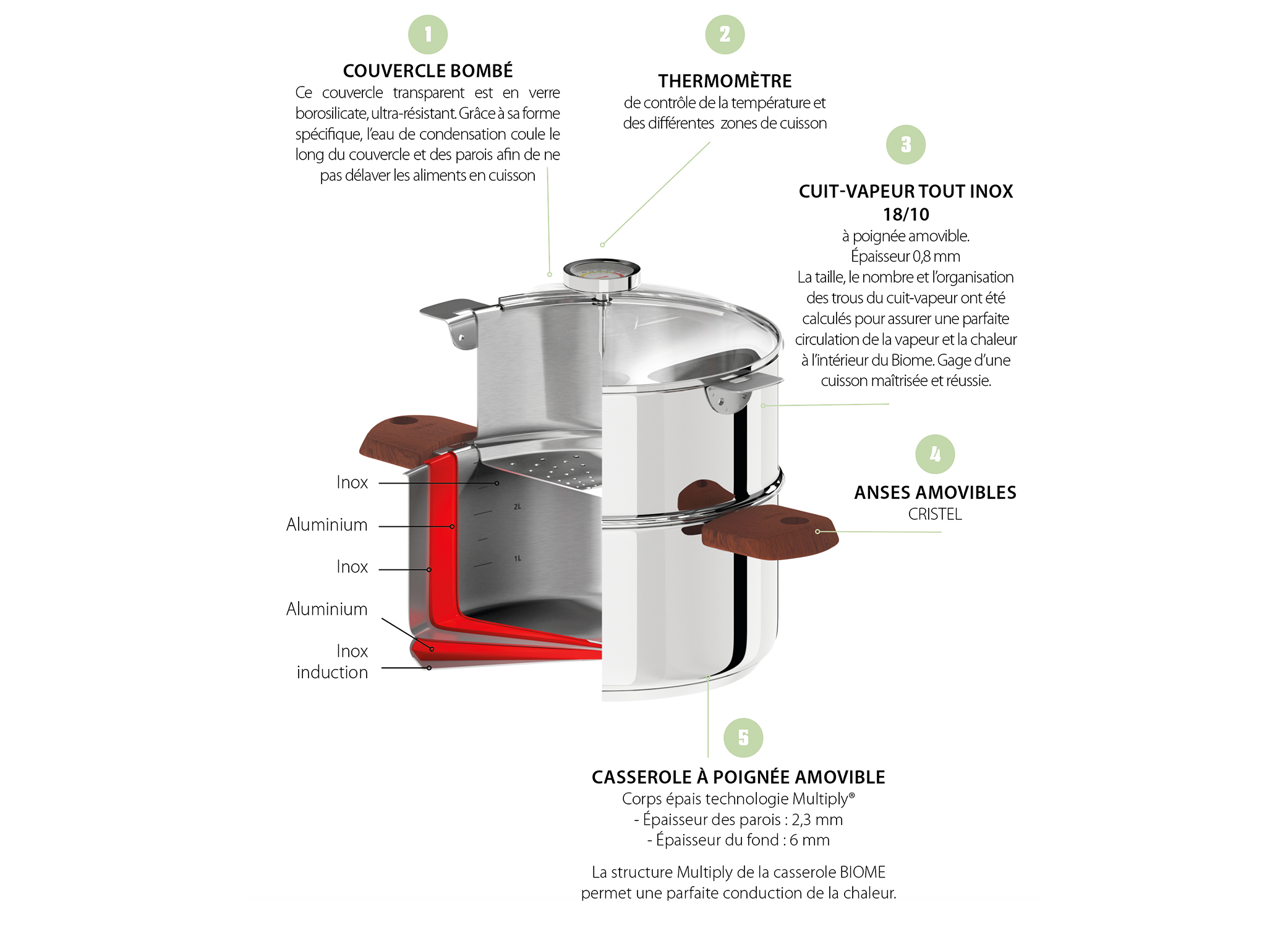 Le cuiseur Biome, comme tous les produits CRISTEL, est garanti à vie, fabriqué en inox de la meilleure qualité (18/10), recyclé à plus de 85% et recyclable à 100%.