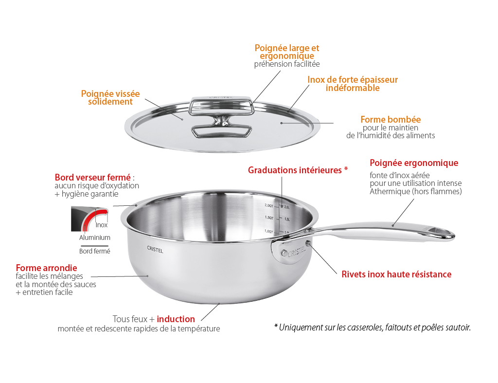 - Sauciers, poêlons, rondeaux, sautoirs, poêles déclinés en de nombreux diamètres et deux profondeurs conviendront aux utilisateurs les plus exigeants.