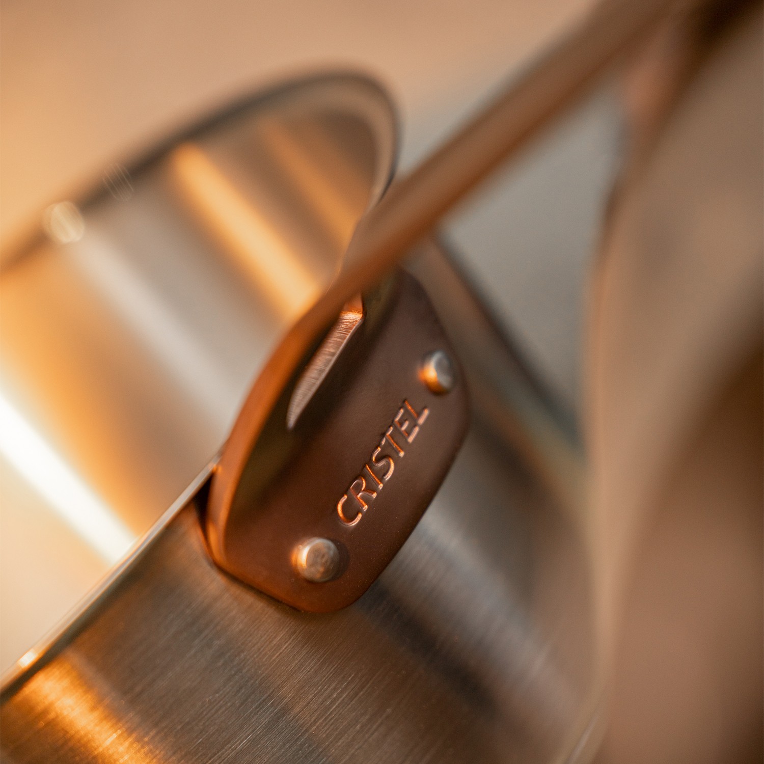 - Poignée plate cuivrée, rivetée et athermique en inox forgé.