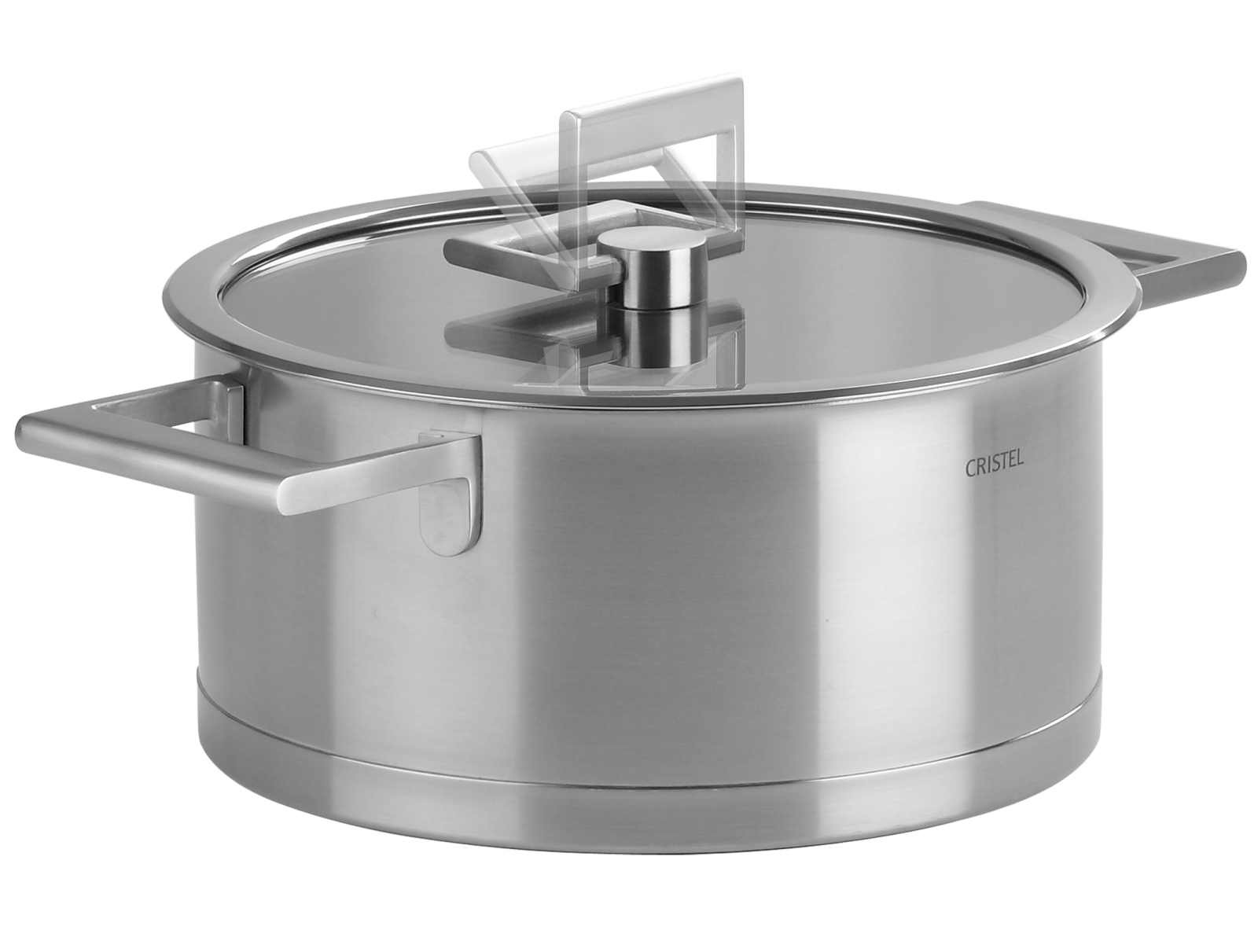 Faitout inox 18/10, finition brossée, anses en fonte d’inox, et couvercle plat en verre cerclé inox Strate Fixe.