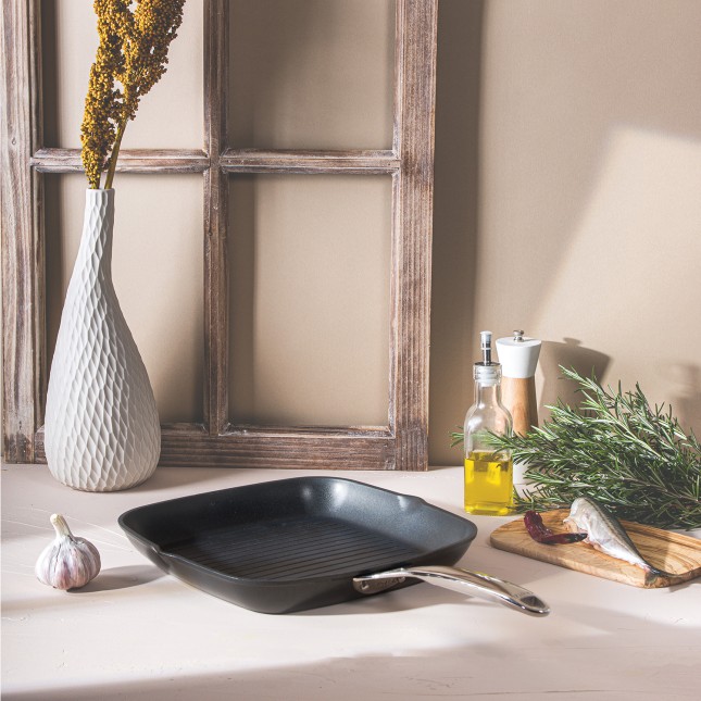 Gril carré, format 28 x 28 cm, en construction Ultralu revêtu de l’antiadhésif ultra-résistant Exceliss+ sans PFOA ni PFOS.