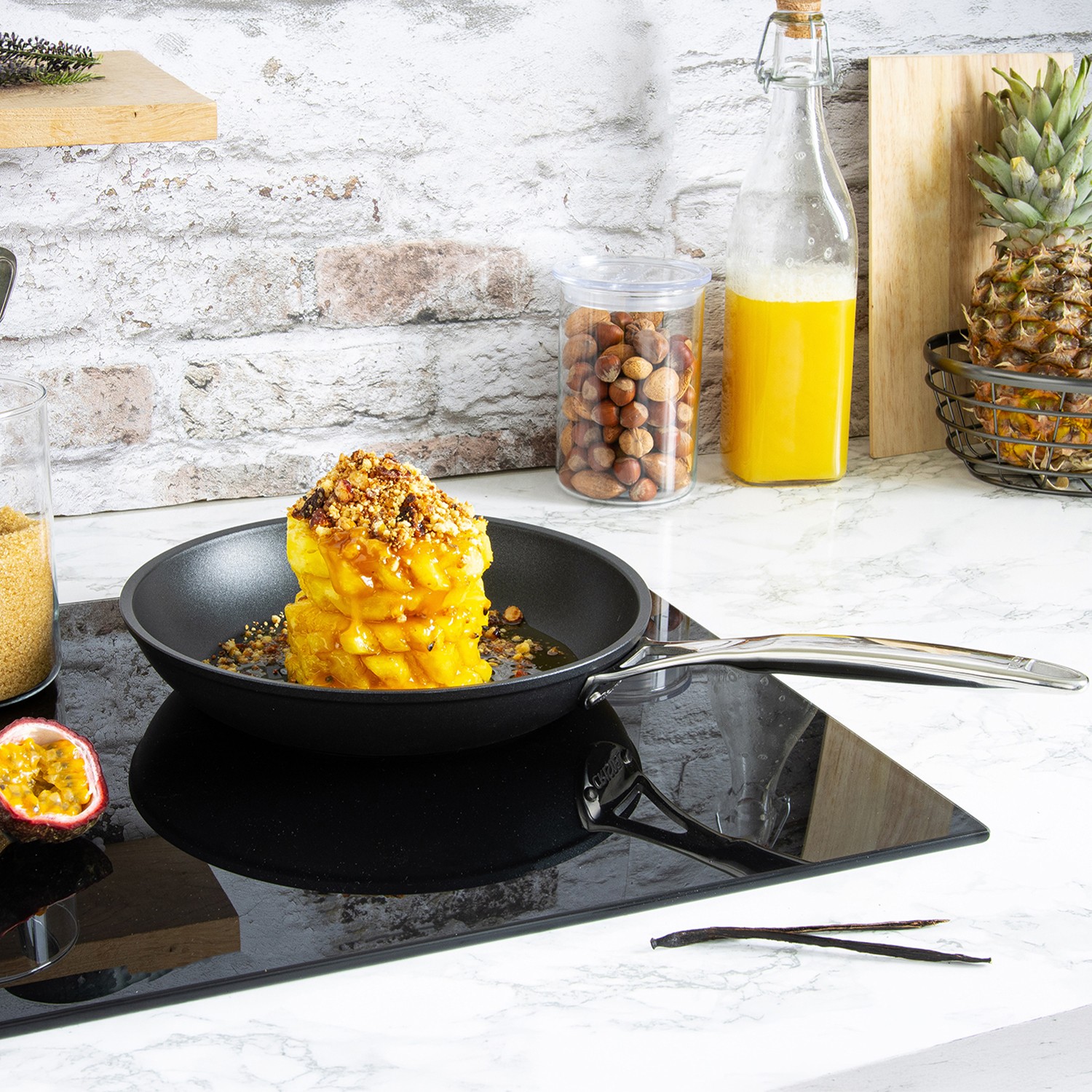 Poêle en aluminium, poignée en inox rivetée et revêtement anti-adhésif Exceliss®+ sans PFOA et sans PFOS.
