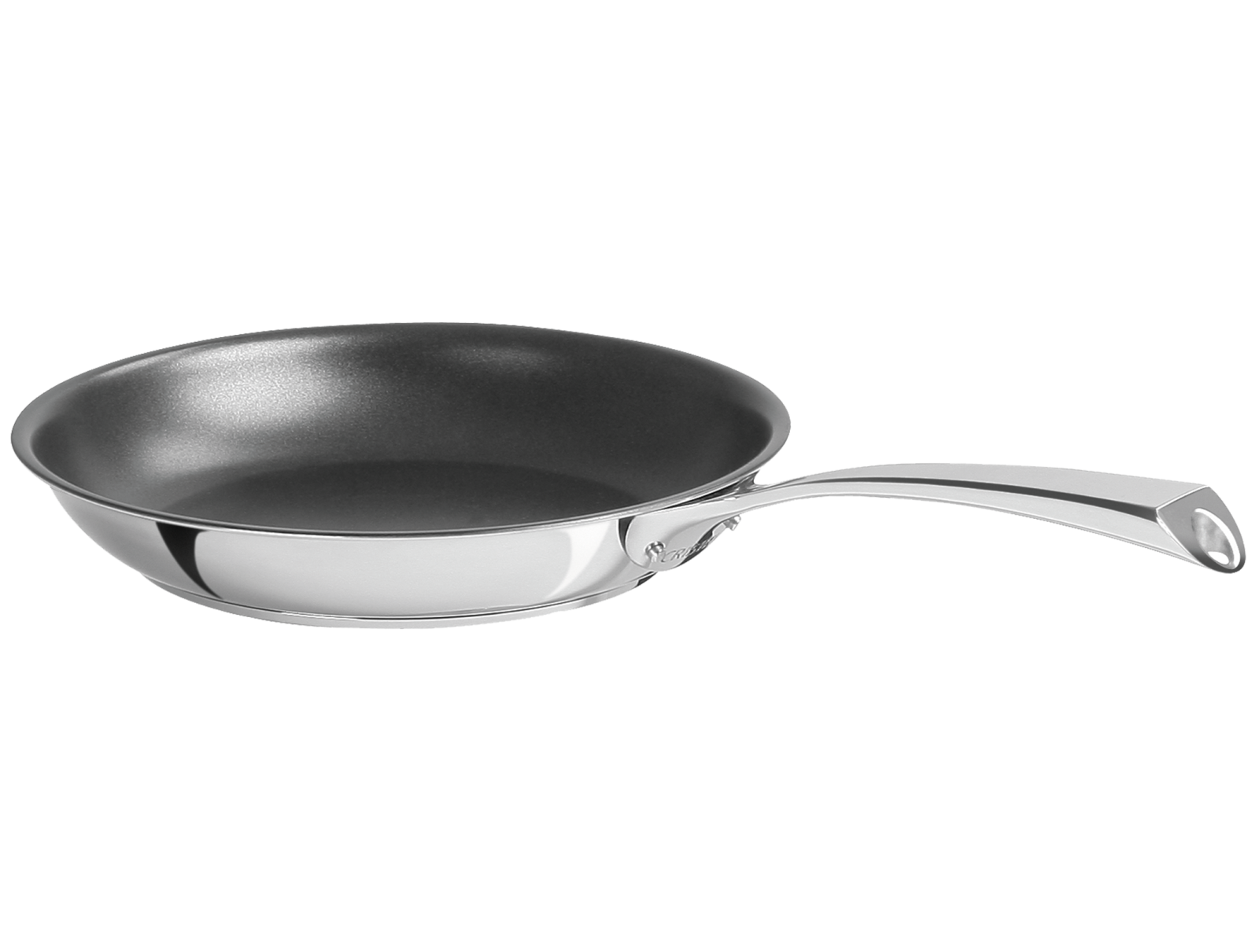 Poêle inox finition brillant miroir technologie Multiply trilaminé, inox / aluminium / inox sur les côtés et 5 couches inox / aluminium / inox / aluminium / inox induction sur le fond.