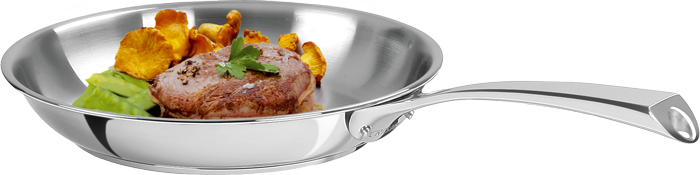 Poêle inox finition brillant miroir technologie Multiply trilaminé, inox / aluminium / inox sur les côtés et 5 couches inox / aluminium / inox / aluminium / inox induction sur le fond. Poêle à poignée amovible de la collection Casteline Amovible.