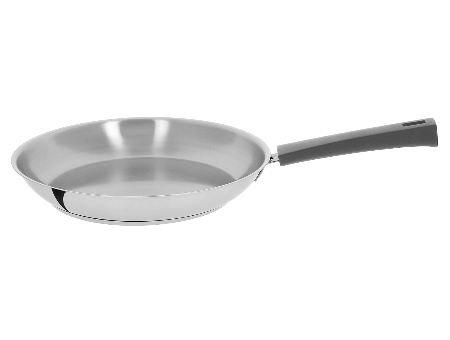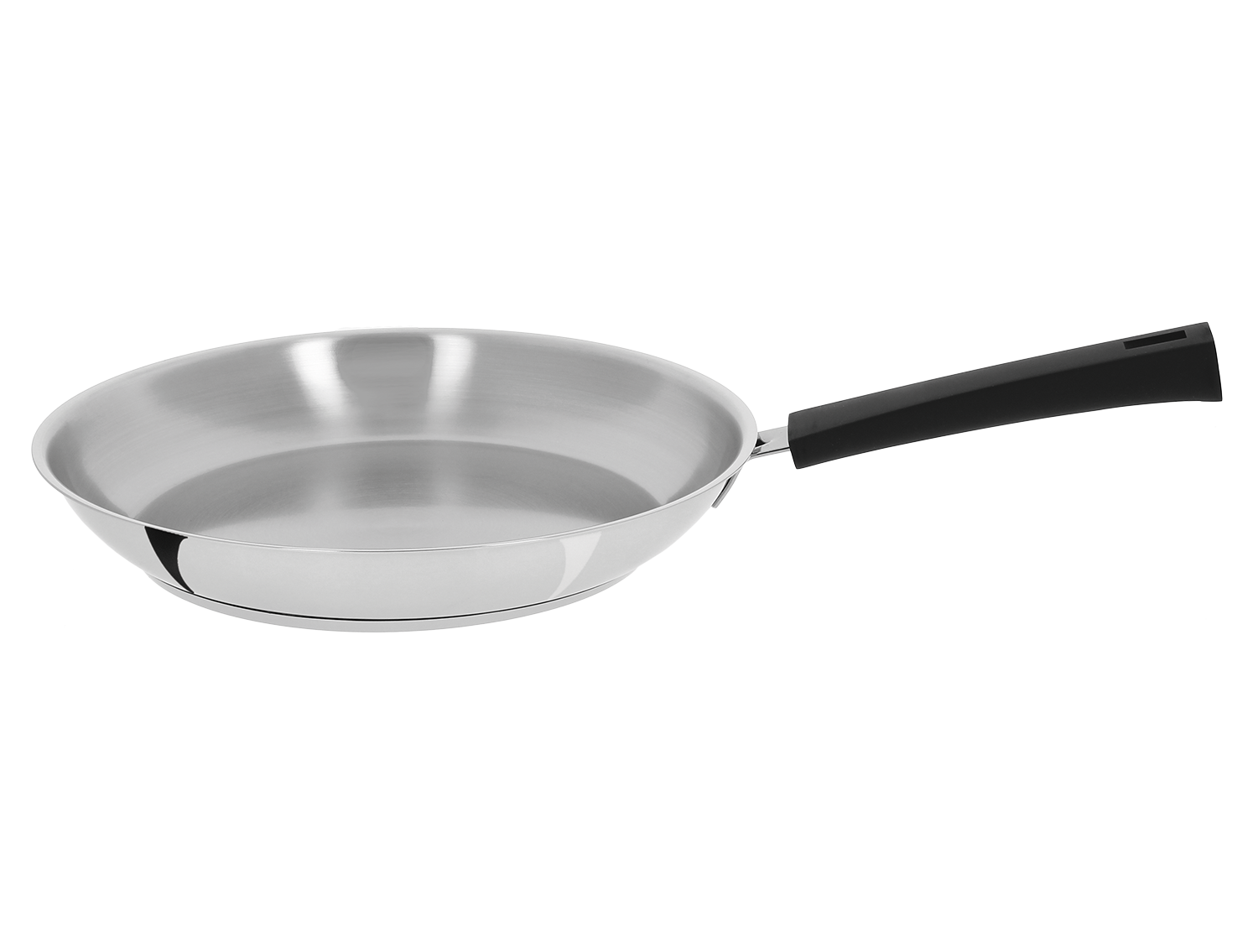 Poêle inox 18/10, finition brillant miroir, poignée fixe en bakélite noire, de la collection Mutine Fixe.