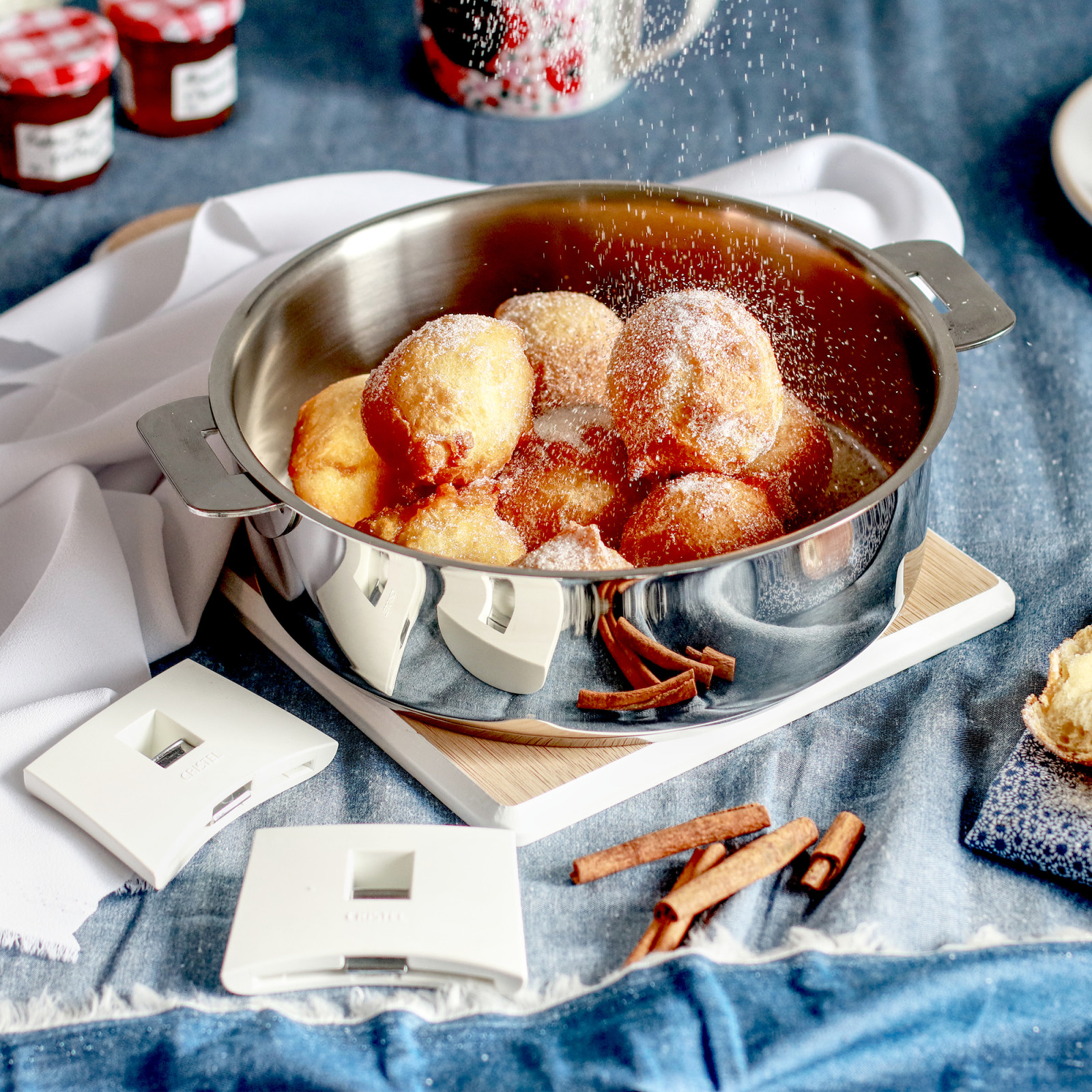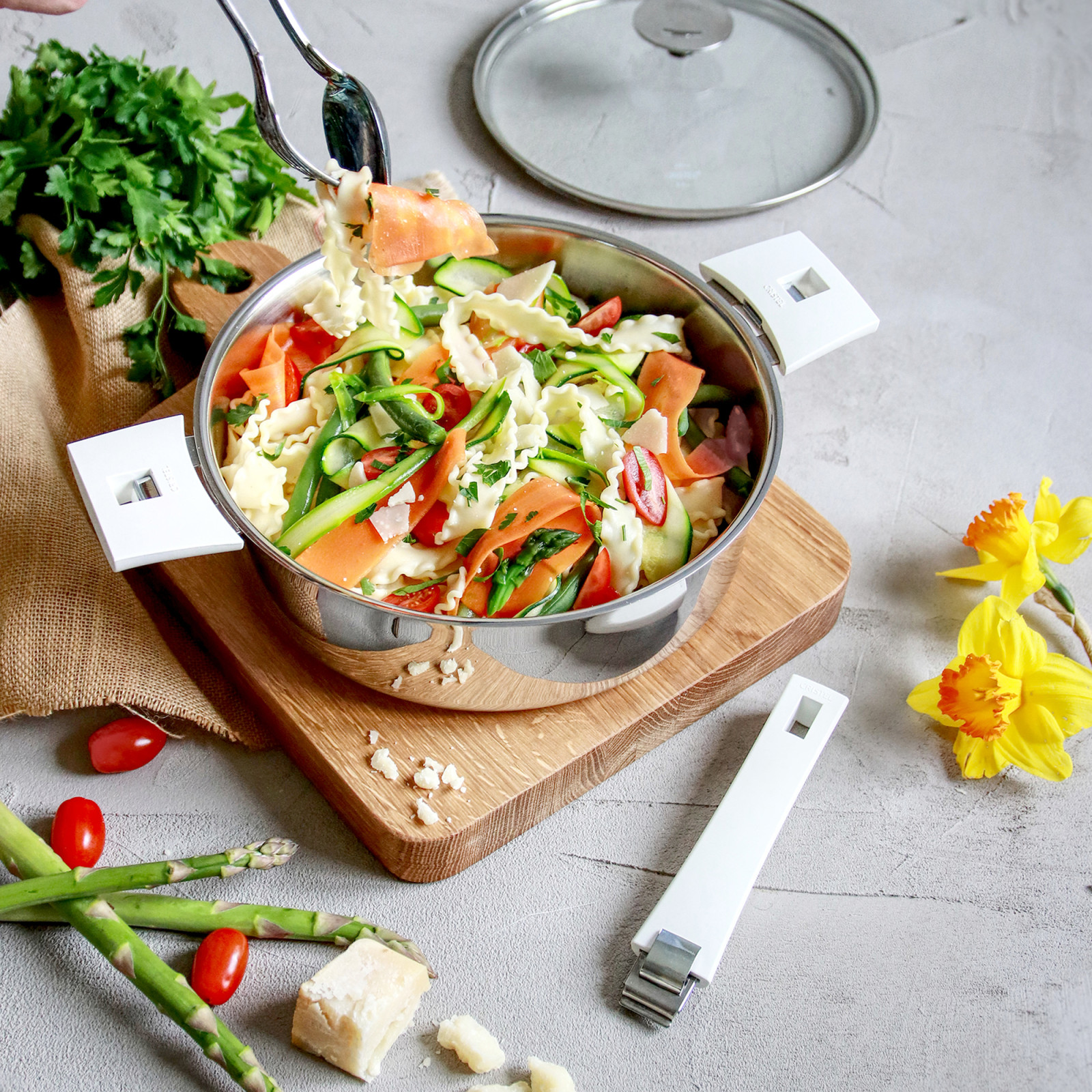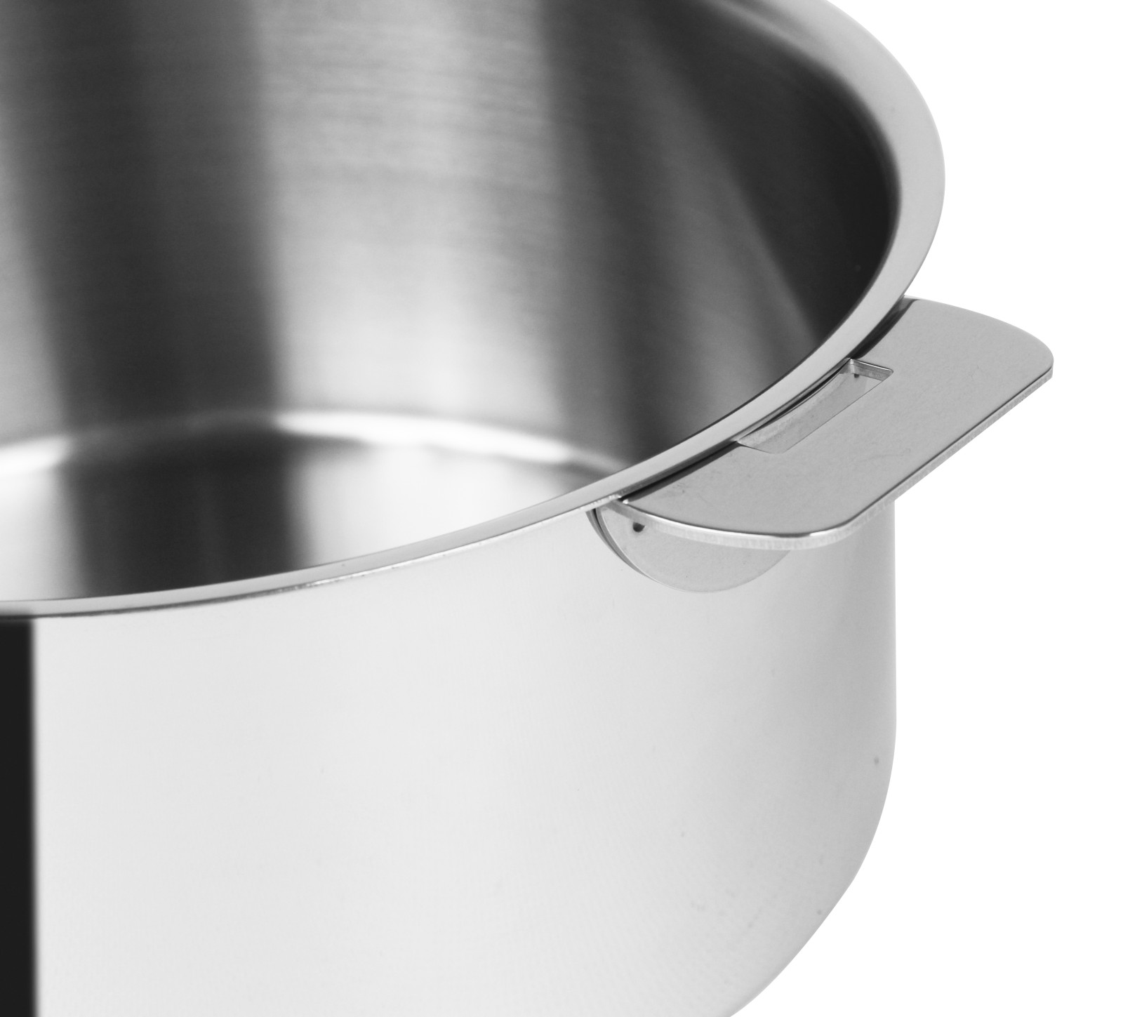 Emblème du concept « Cuisson-Service », la sauteuse inox passe de la cuisine à la table et se transforme en plat de service en se parant de 2 anses.