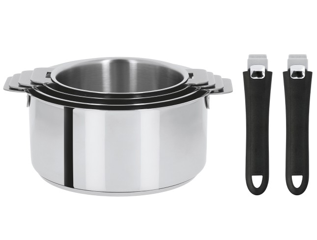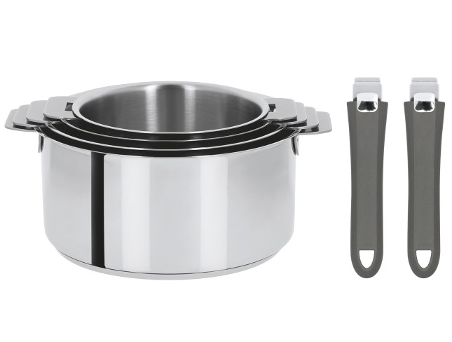 Référence concernée : S4CMA2F - Set de 4 casseroles inox + 2 poignées amovibles colorées -