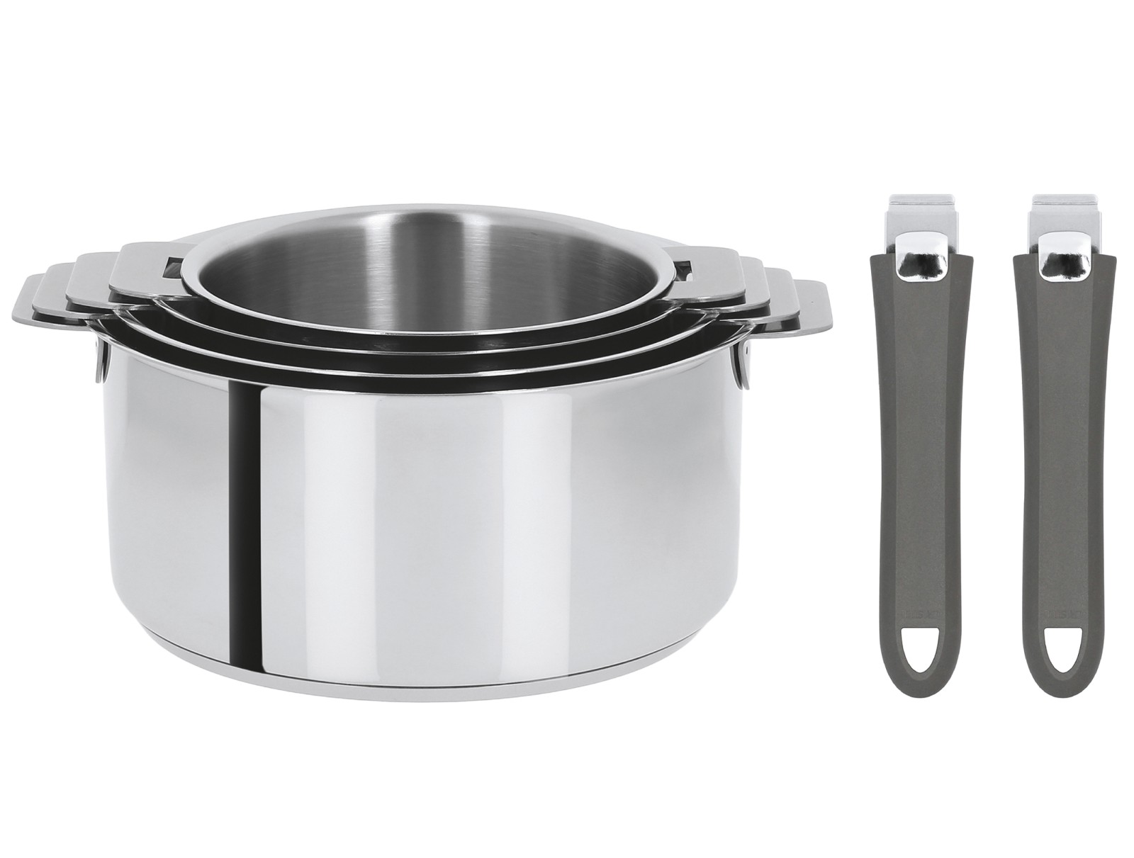Référence concernée : S4CMA2G - Set de 4 casseroles inox + 2 poignées amovibles colorées -
