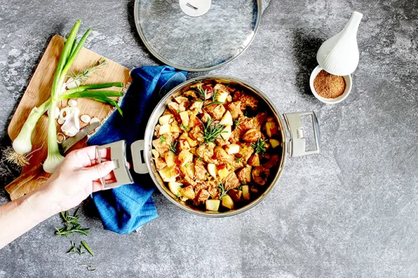 7 Augmenter la température à 200°C. Mélanger un peu les ingrédients, retirer le couvercle et cuire encore 10 minutes le temps de faire dorer les pommes de terre.