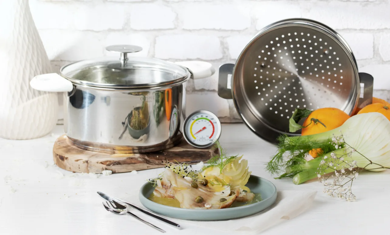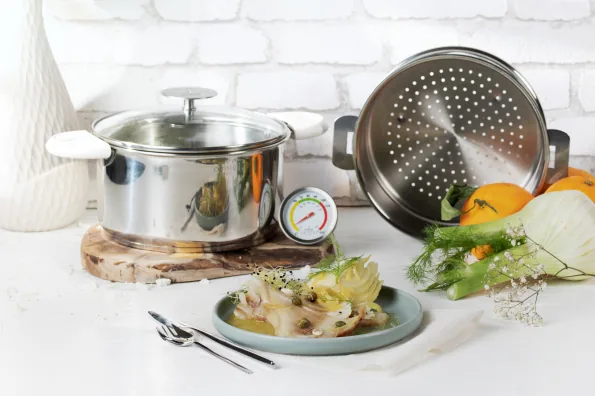 4 Mettre le panier cuit-vapeur avec le couvercle et le thermomètre sur le faitout BIOME. Quand la température atteint 90°C abaisser au 1/3 de la puissance de la plaque et laisser cuire 15 minutes pour le biome 20 cm/ 18 minutes pour le 24 cm.