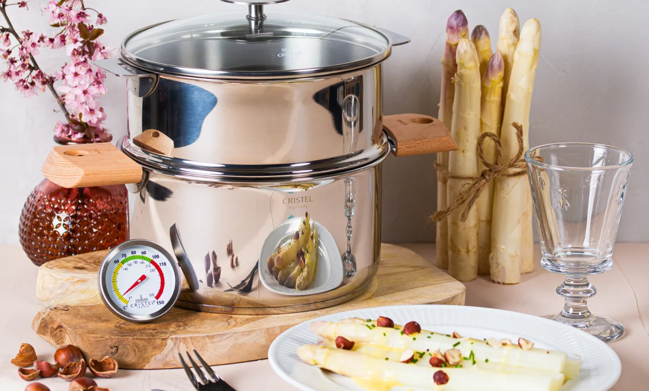 4 Cuire 13 minutes dans le Biome 20 cm et 15 minutes pour le 24 cm. Faire refroidir les asperges.
