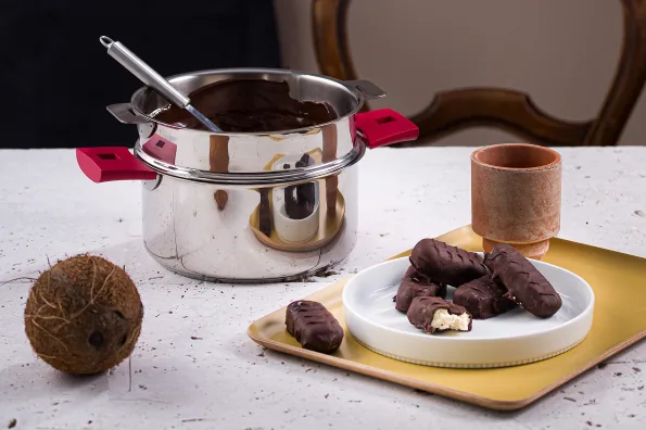 5 Sortez les barres de coco du congélateur puis les enrober dans le chocolat fondu.