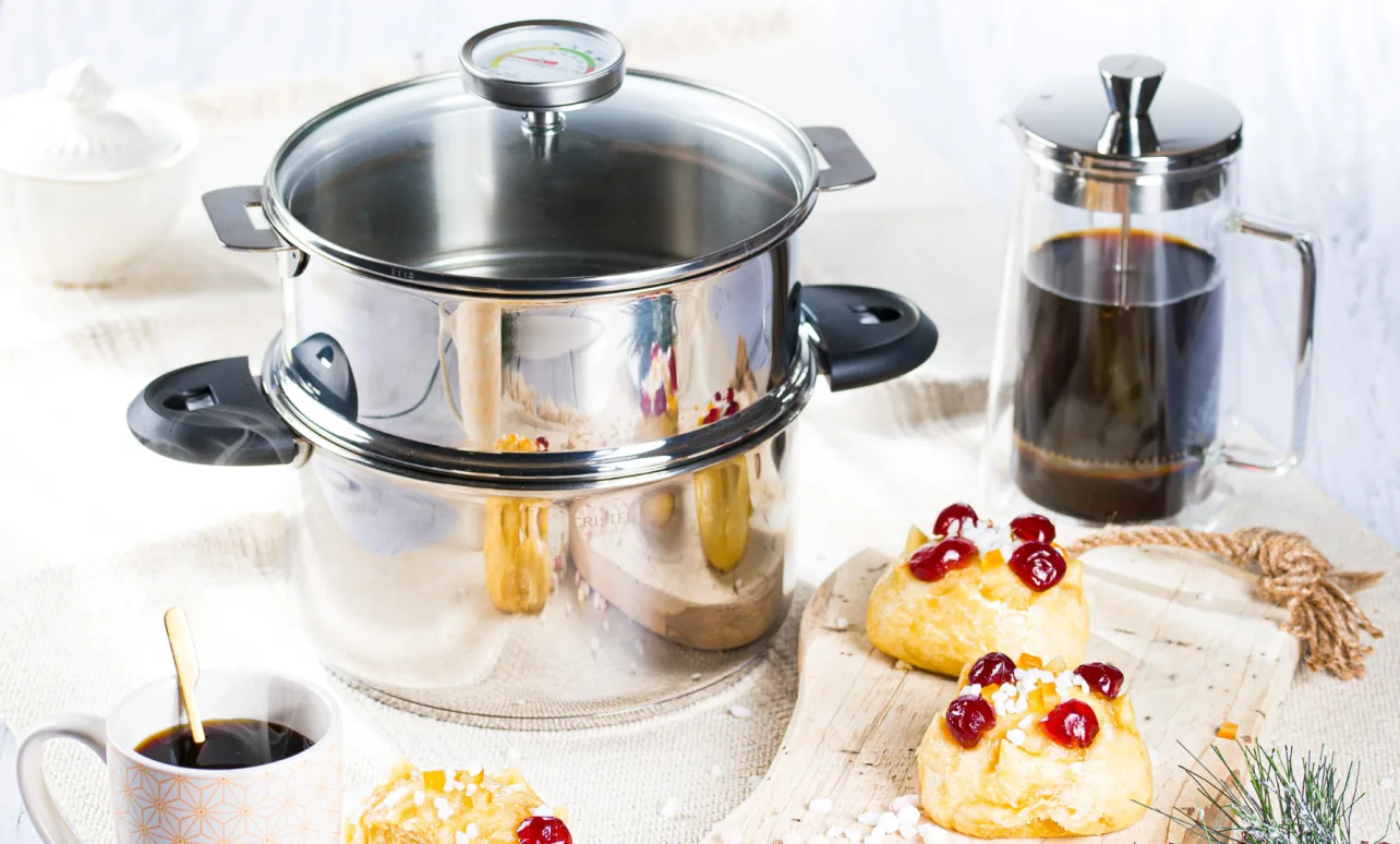 6 Mettre 1/2l d’eau dans le faitout de 20 cm et 1l dans le 24 cm, puis poser le panier vapeur ainsi que le couvercle avec la sonde.