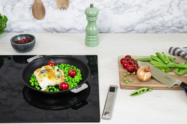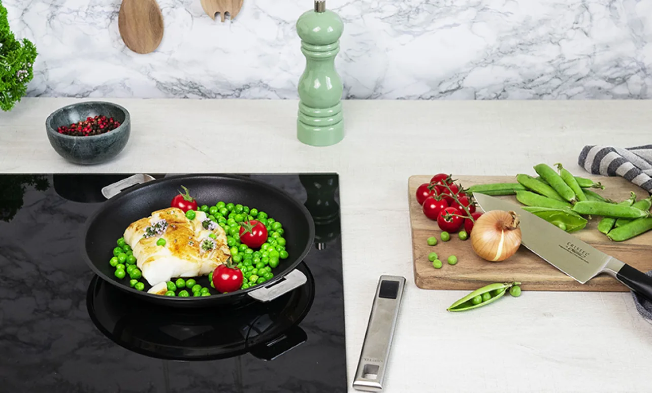 2 Faire chauffer la poêle CRISTEL au 2/3 de la puissance de la plaque et déposer les dos de cabillaud préalablement assaisonnés.
