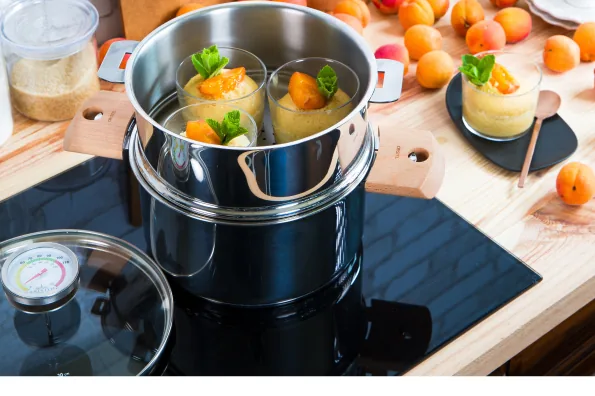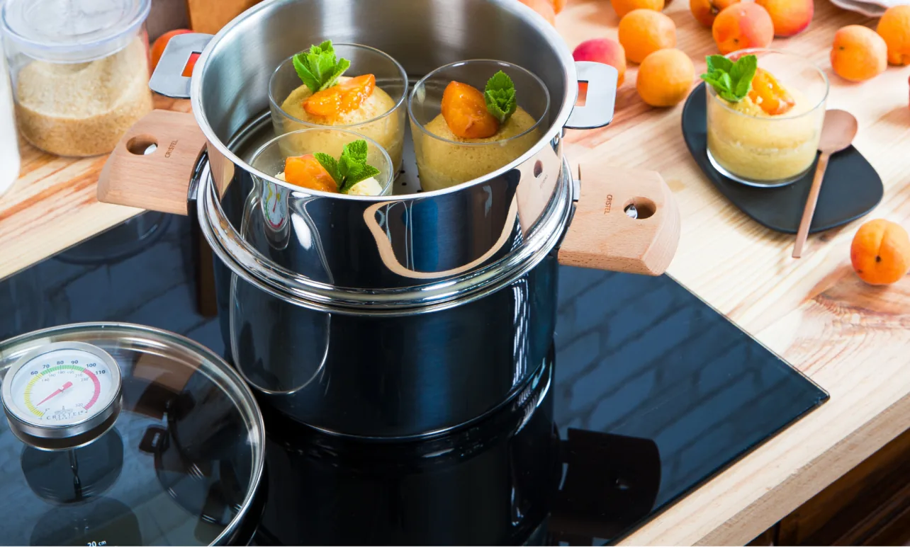 5 Mettre ½ l d’eau dans le faitout biome 20cm et 1 l dans le 24cm. Mettre le panier vapeur avec les ramequins puis fermer avec le couvercle + sonde.