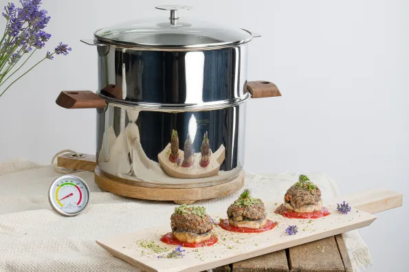 5 Dans le faitout BIOME 20cm , verser 50 cl d’eau et 1l dans le 24 cm puis mettre en chauffe avec le cuit vapeur et le couvercle au maximum de la puissance de la plaque de cuisson.