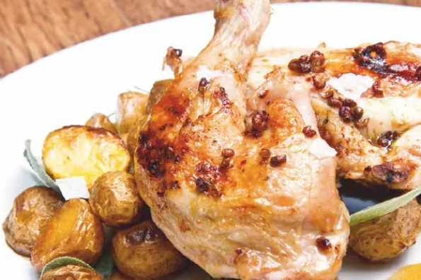 1 Découper le coquelet en quatre et laver les pommes de terre.