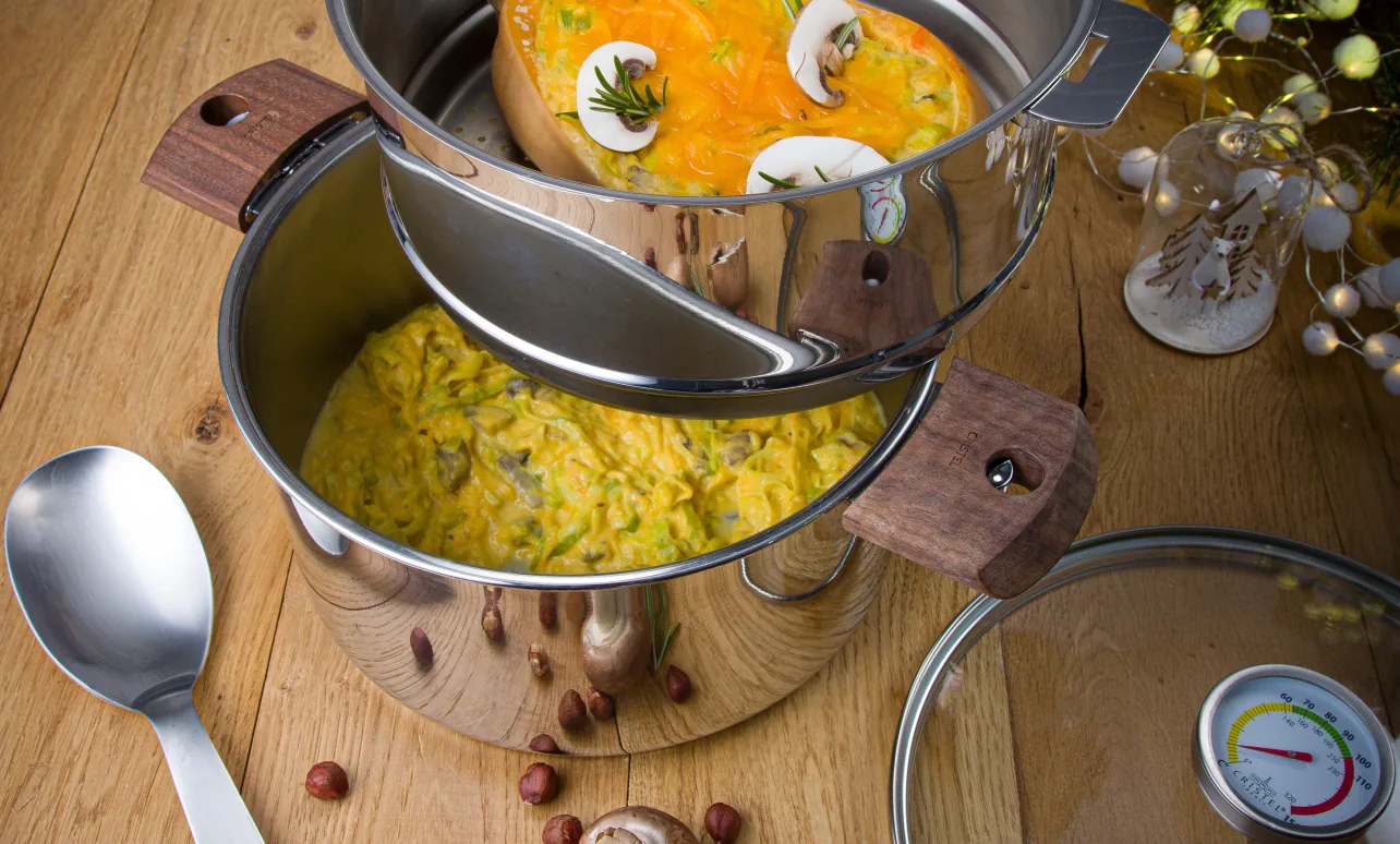 2 Verser un demi litre d’eau dans le Faitout BIOME 20 cm et 1l dans le 24cm . Déposer le butternut et les morceaux dans le panier vapeur, fermer le tout avec le couvercle et la sonde. Mettre en chauffe le faitout BIOME au maximum de la puissance de la plaque de cuisson.