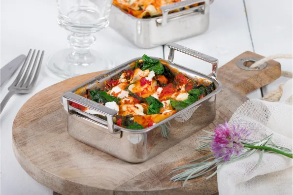 4 Déposer au fond des minis plats à four un morceau de feuille à lasagne, puis du Brocciu aux épinards et ensuite de la sauce tomate..