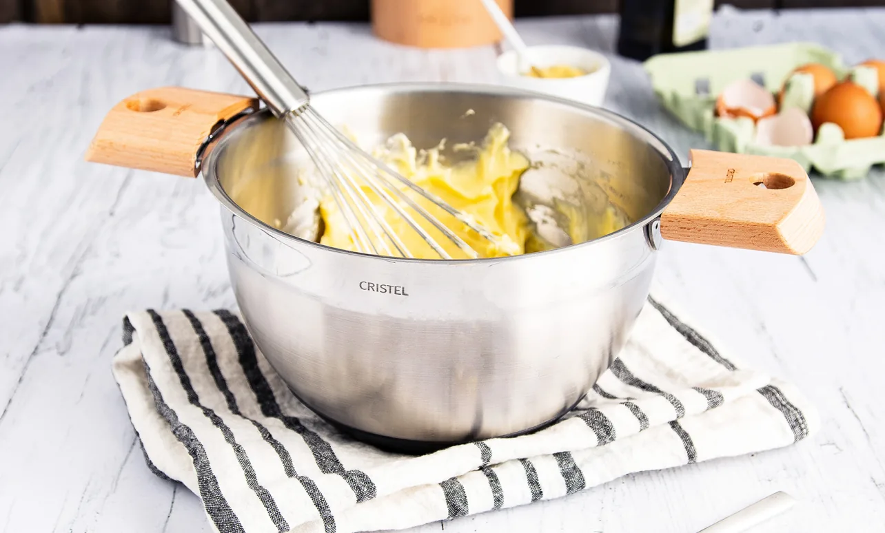 1 Mettre le jaune d’oeuf, la moutarde, du sel et la moitié du vinaigre.
