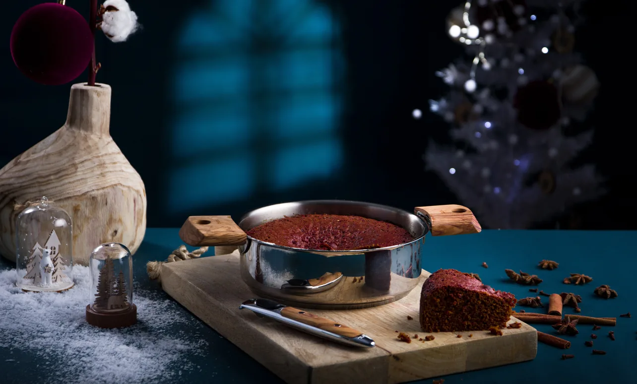 6 Verser la préparation à pain d’épices dans la sauteuse puis cuire 1 heure.