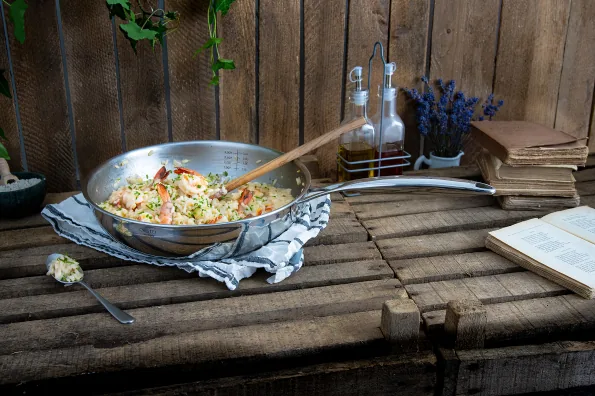 11 Une fois le riz cuit remettre les gambas dans le risotto pour les réchauffer et ajouter le beurre avec le parmesan.