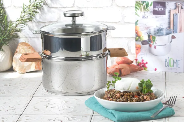 2 Le lendemain, mettre 1 l d’eau dans la cuve du biome 24 cm et 1/2 l dans le 20 cm. Déposer le panier vapeur avec les lentilles rincées/égouttées et fermer avec le couvercle + sonde.
