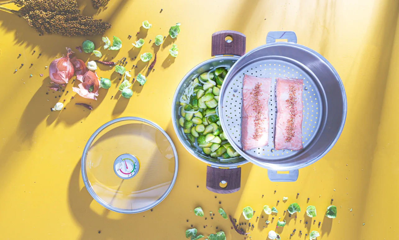 1 Emincer finement l’oignon et ciseler l’ail. Laver soigneusement et couper les choux de Bruxelles en 4. Les déposer dans le cuit vapeur, verser 500g d’eau dans le faitout (1 litre pour le 24 cm) puis fermer le tout avec le couvercle muni de la sonde.