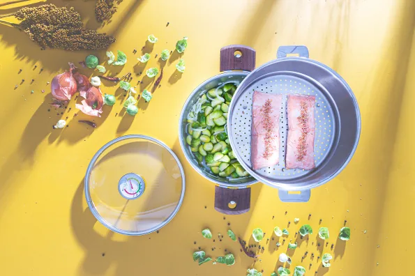 2 Mettre en chauffe à feu vif. Quand la température atteint 95°C baisser au 1/3 de la puissance de la plaque et laisser cuire 15 minutes pour le Biome 20 cm/ 20 minutes pour le 24 cm.