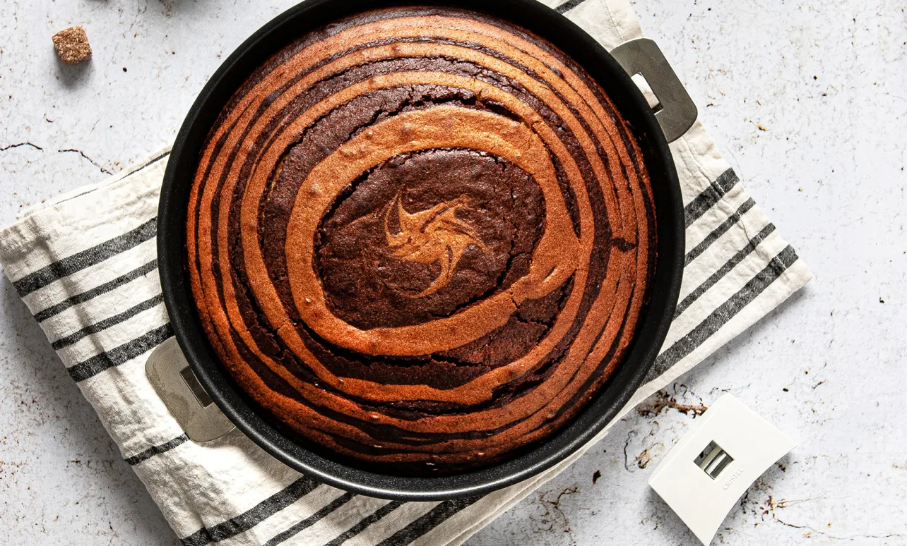 5 Au centre de la poêle, déposer 3 cuillères de la préparation nature puis 3 cuillères de la préparation au cacao par dessus.